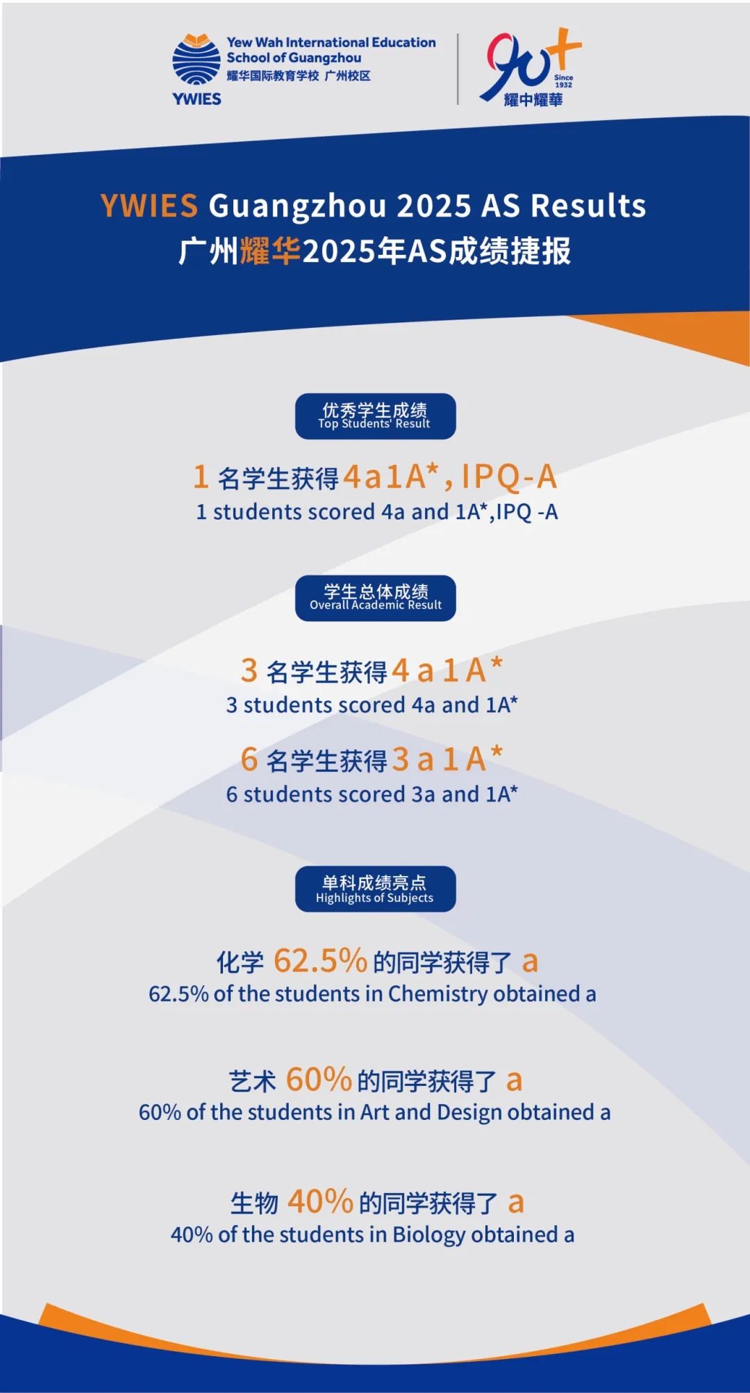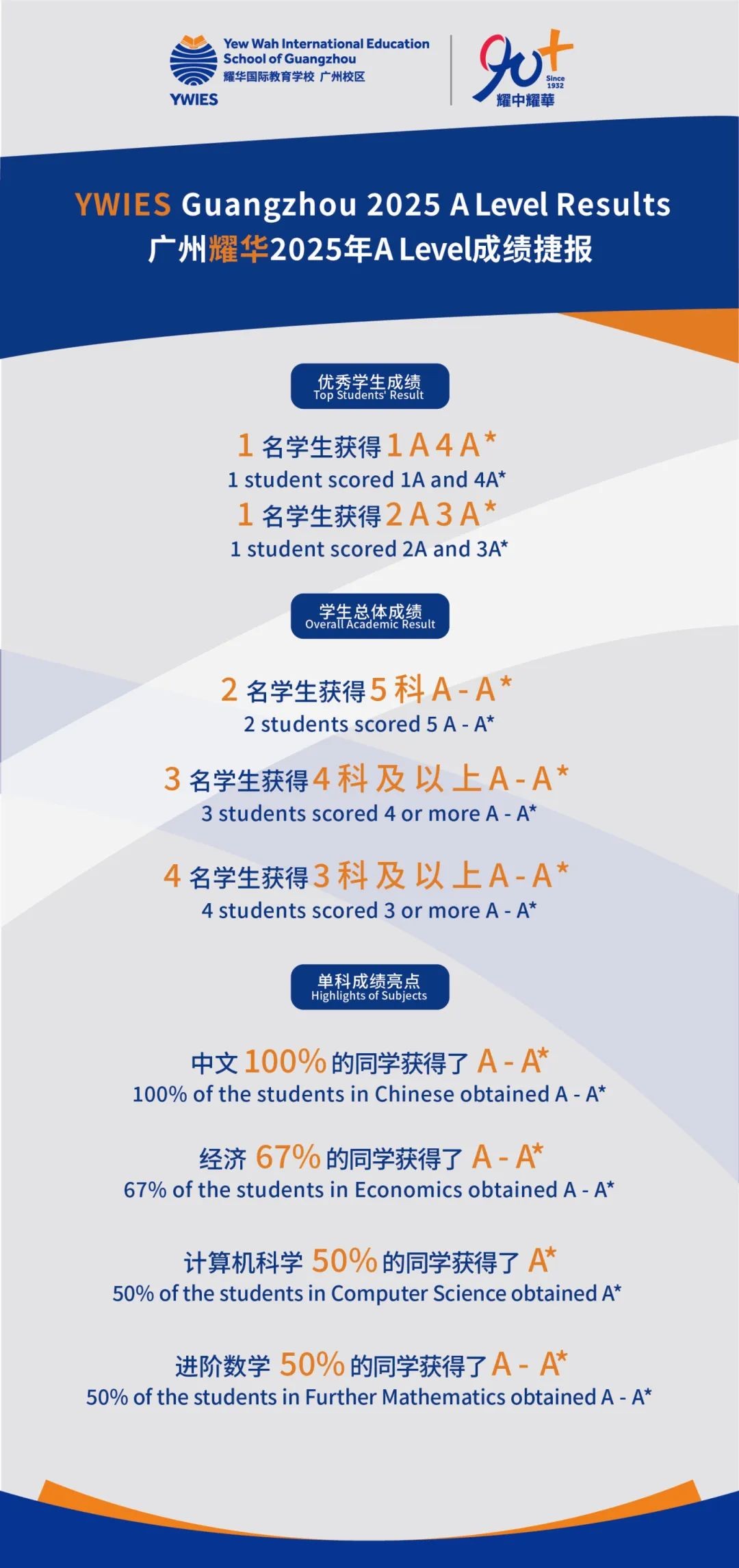 2025年A Level及IGCSE考试于八月中旬陆续放榜。在考生人数再创新高、评分标准持续收紧的背景下,广州耀华的同学依然展现出卓越的学术实力与全面的个人素养,在多个学科中取得优异成绩,不仅体现出耀华学子扎实的知识基础,更展现了出色的多元学习与批判性思维能力。