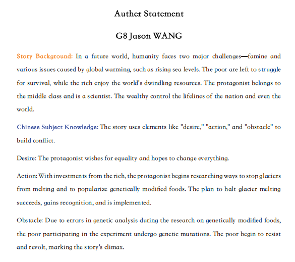 在老师的指导下,每一位同学最终都为自己的成品小说完成了一则颇为正式的Author Statement(作者解说),像是论文前的摘要,又像是投稿时的作品简介。