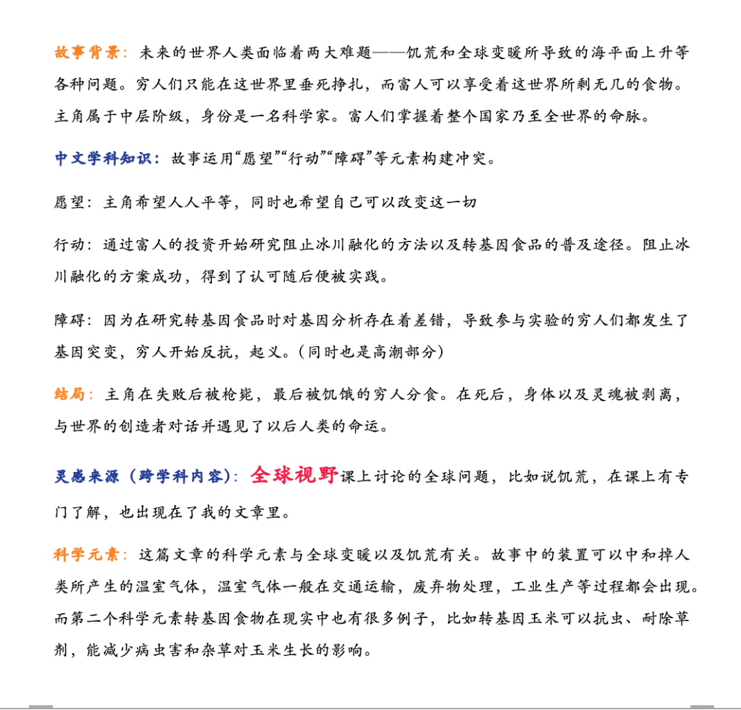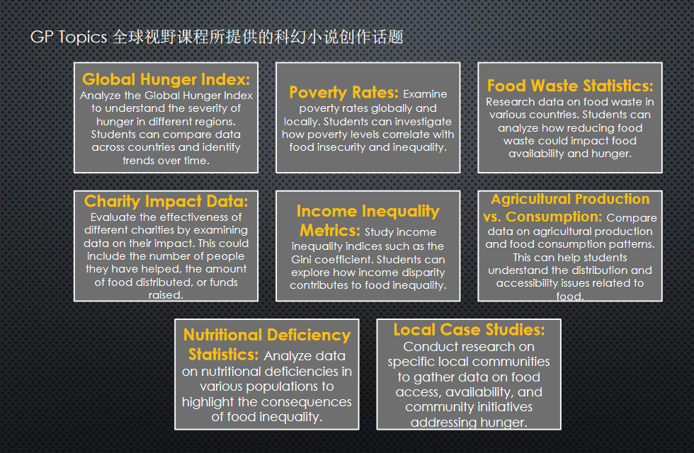 Sophia 提到的正是过去这个学年广州耀华八年级学生的跨学科写作项目:在语文学科原有的"小说写作单元"的基础上,引入科学(Science)与全球视野(GP, Global Perspective)课程知识,将小说写作任务进一步细分为硬科幻和软科幻。硬科幻班级的同学必须从实打实的科学原理出发,比如计算不同维度的时间流速差异;软科幻班级的同学也同样要探究我们正在面对的社会问题,比如构建反乌托邦剧情、讨论人工智能伦理。