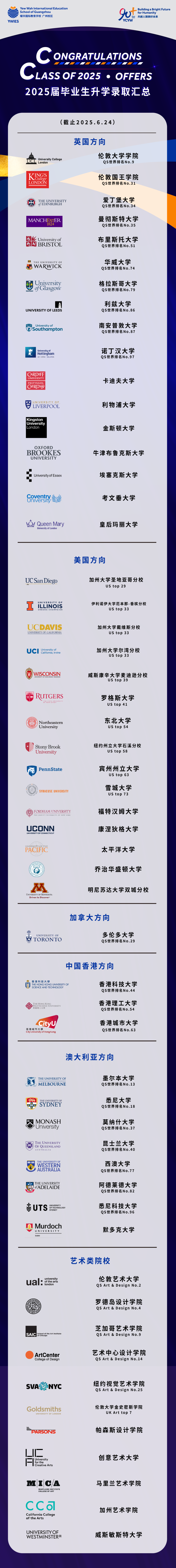 2025届高中毕业生收到了百余封大学录取通知书,其中25%的学生获得全球综合排名前30名大学录取资格,40%的学生大部分身居前50强,方向艺术学生更是100%斩获全球前20名艺术院校录取资格。