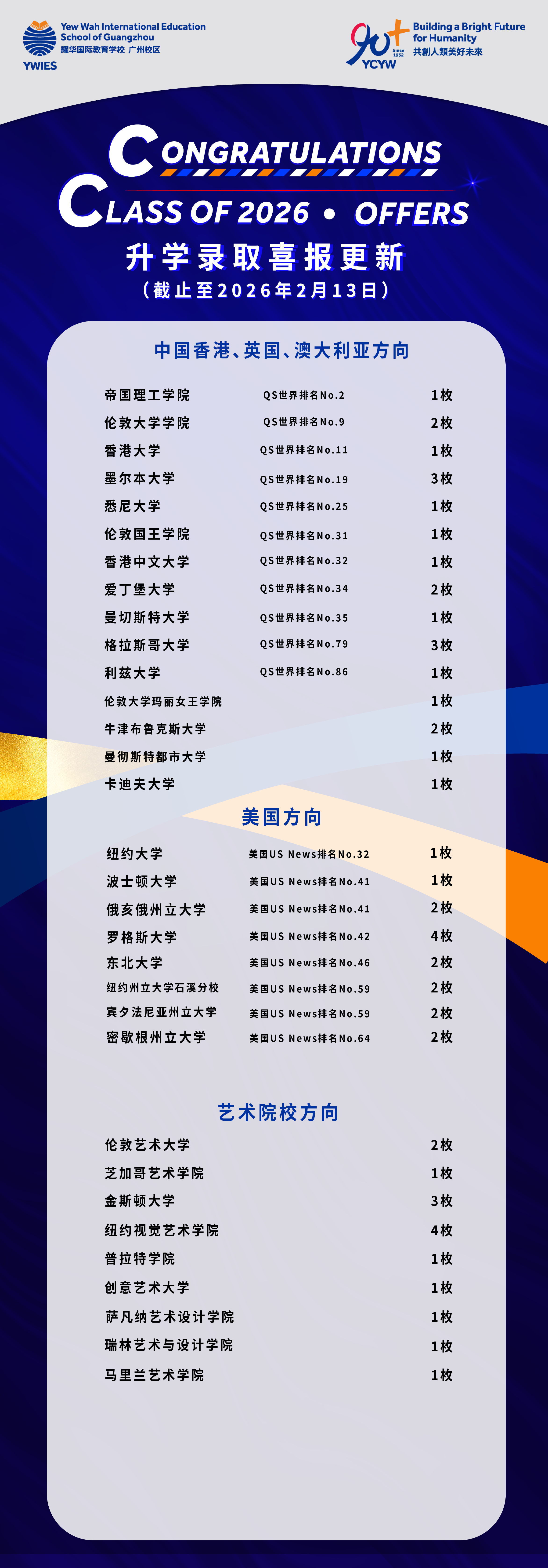 截至2026年2月13日,广州耀华2026届毕业生已收获来自英国、美国、澳大利亚、中国香港等多个国家和地区顶尖大学的录取通知书,涵盖理工、商科、人文、艺术等多个领域共24个专业,赢得近355万人民币的奖学金,可谓硕果累累,亮点纷呈!