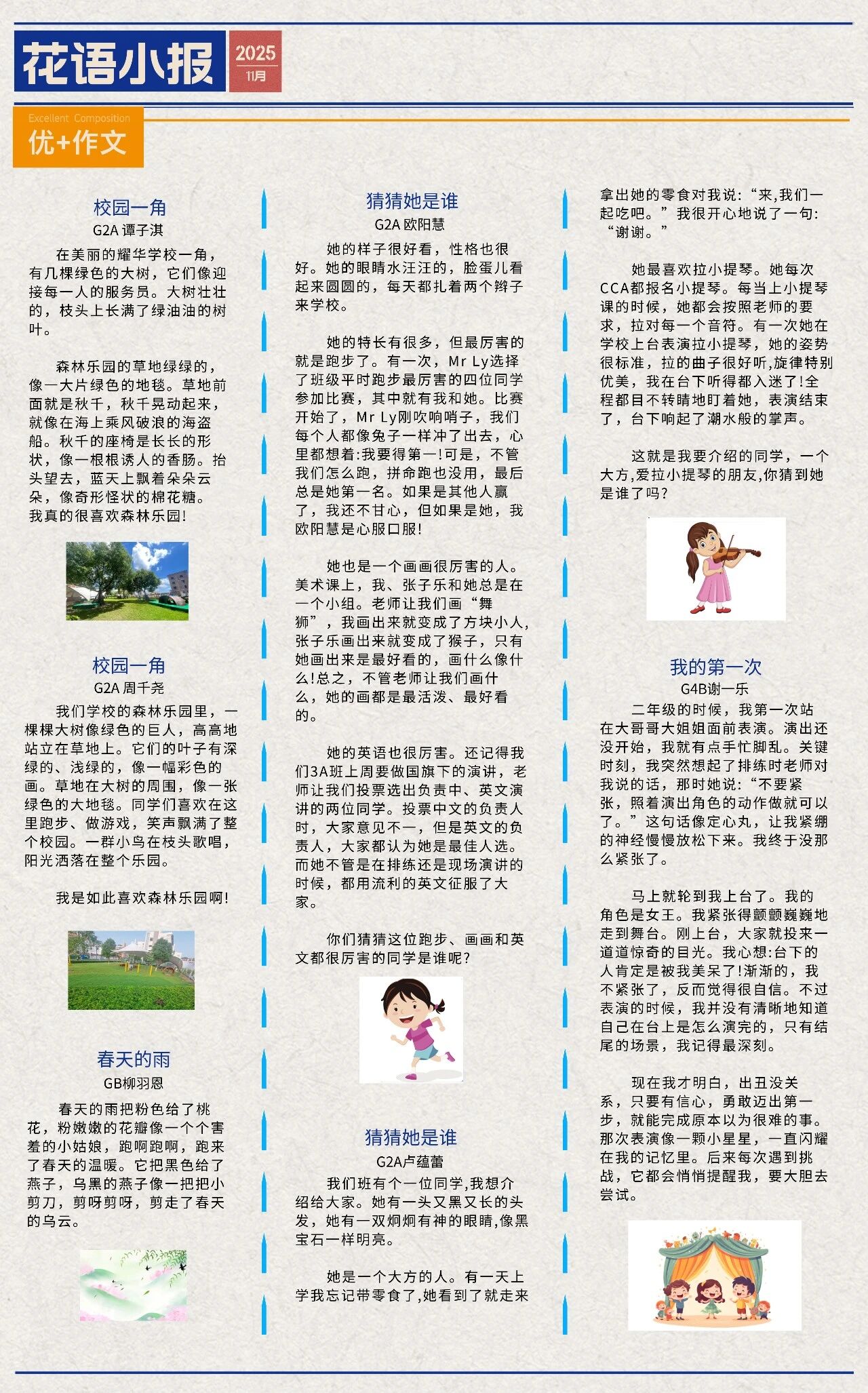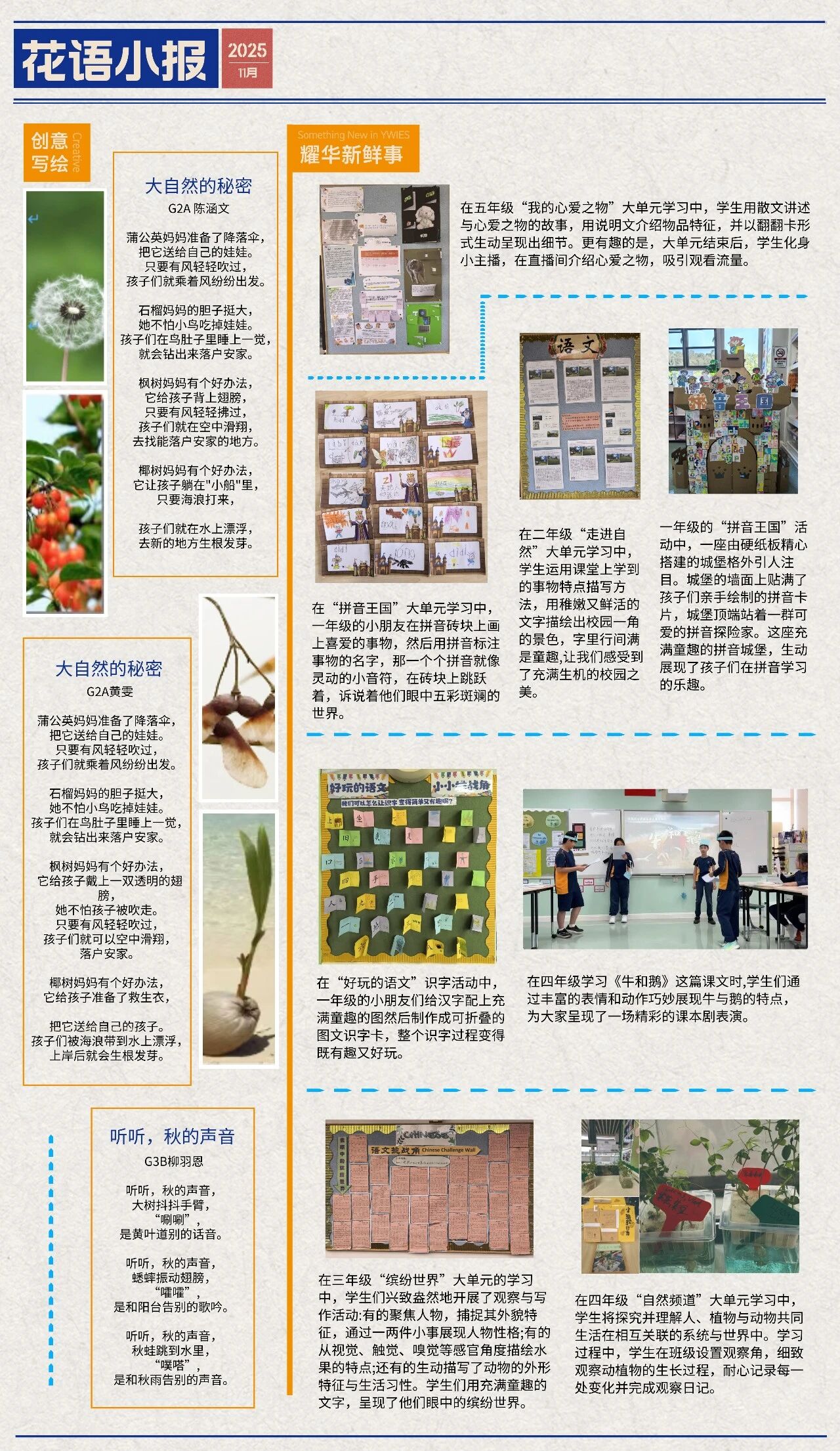 这份小报源自广州耀华国际学校小学部作品集《花开的声音》,如今抽枝展叶,成为了一个独属于小学部学子的展示与交流平台。我们以“花语”为媒,借花朵的意象传递心声、描绘成长,让每一份稚嫩的才华都有机会被看见、被倾听。