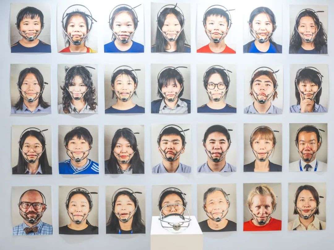 走进今年的艺术展,首先映入眼帘的是毕业生Bella的一件装置艺术。那是个铁打的面具,乍一看有些类似犬类的止咬器,左右两边各有獠牙式的尖钩将佩戴者的嘴角强制性地提起。Bella为这件作品取名「微笑机器」,并拍摄了30位师生佩戴后的效果图。证件照格式的照片整整齐齐排满背景墙,上面几乎每一个人都在装置的约束下露出了不自然的微笑。