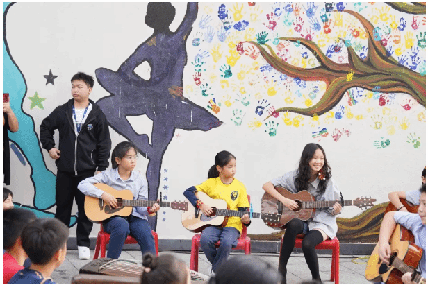 在这样一个“非正式”舞台上,你可以看到二年级学生的古筝独奏,也可以看到小学老师和五年级学生组合起来的摇滚乐团表演──外教老师负责贝斯,孩子们一个弹电吉他、一个打架子鼓。