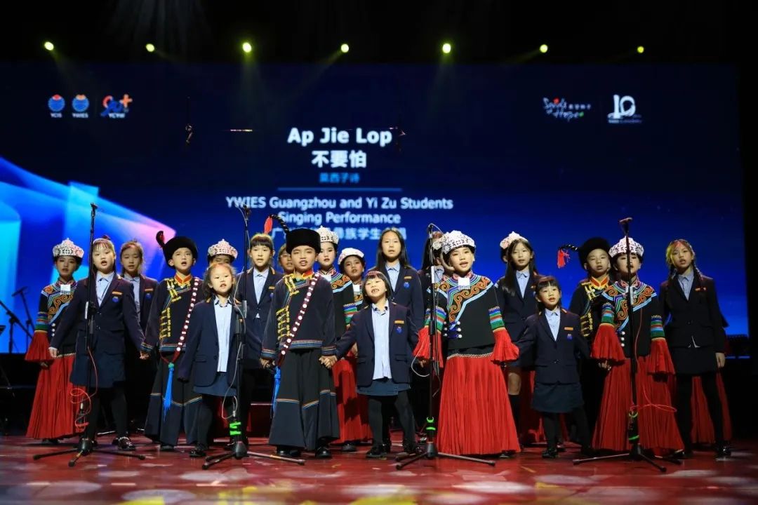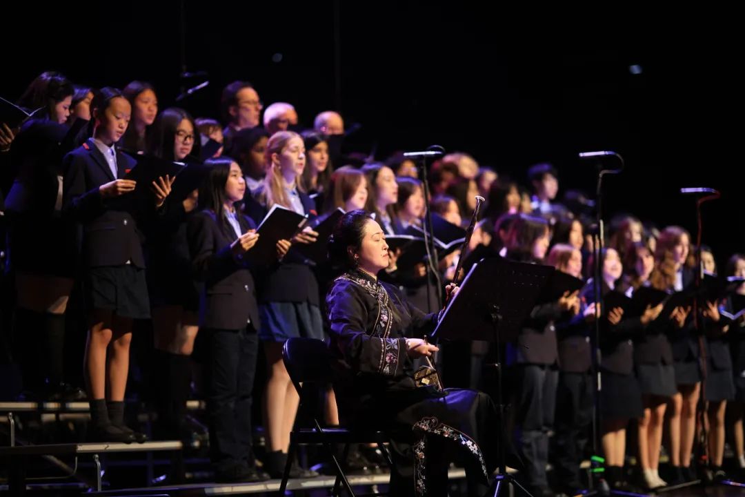 本次音乐会另一个让人惊喜的节目由12位彝族的孩子带来,他们为观众呈现了中国传统乐器“月琴”曲目《千里田凉山迎新春》,同时也与广州校区的同学一起合唱了Ms. Hannah编排的彝族歌曲《Ap Jie Lop不要怕》。在短时间内学习一首由陌生语言演绎的歌曲,对于广州校区的孩子来说是一个极大的挑战。在排练期间,Ms. Hannah感受到了彝族小朋友对音乐的热爱和执着,这种热爱和纯粹也吸引和鼓舞了耀华的同学们。不同文化背景的孩子们相互学习、相互帮助,这种跨越文化差异的友谊和合作,正是音乐的魅力,让语言不再成为障碍,让每一个参与其中的人成为彼此的知音。